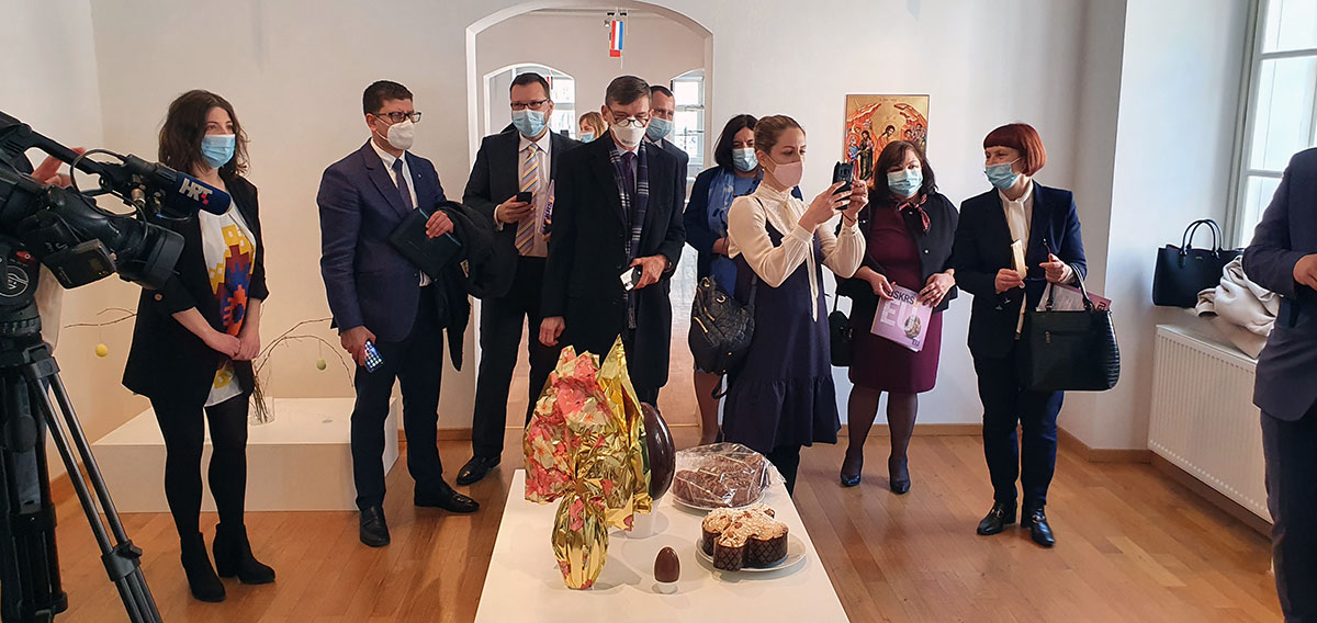 Izložba “Uskrs u Europskoj uniji” otvorena je u prisustvu čak osam predstavnika veleposlanstava od koji je petero veleposlanika. Riječ je o slovačkom, švedskom, slovenskom, češkom, belgijskom, bugarskom, austrijskom i litvanskom veleposlanstvu, koja su, uz mnoga druga, ali brojne ustanove te pojedince, sudjelovala u stvaranju bjelovarske izložbe međunarodnoga karaktera. Izložbu je službeno otvorio zamjenik gradonačelnika Igor Brajdić. Prisutnima u atriju Muzeja obratili su se i njegov ravnatelj Milan Pavlović te autorica izložbe, kustosica Marijana Dragičević. Gostima je tom prilikom predstavljena i naša najstarija pisanica iz 15. stoljeća, pronađena na lokalitetu Gudovac-Gradina, a koja se čuva u bjelovarskom Muzeju.