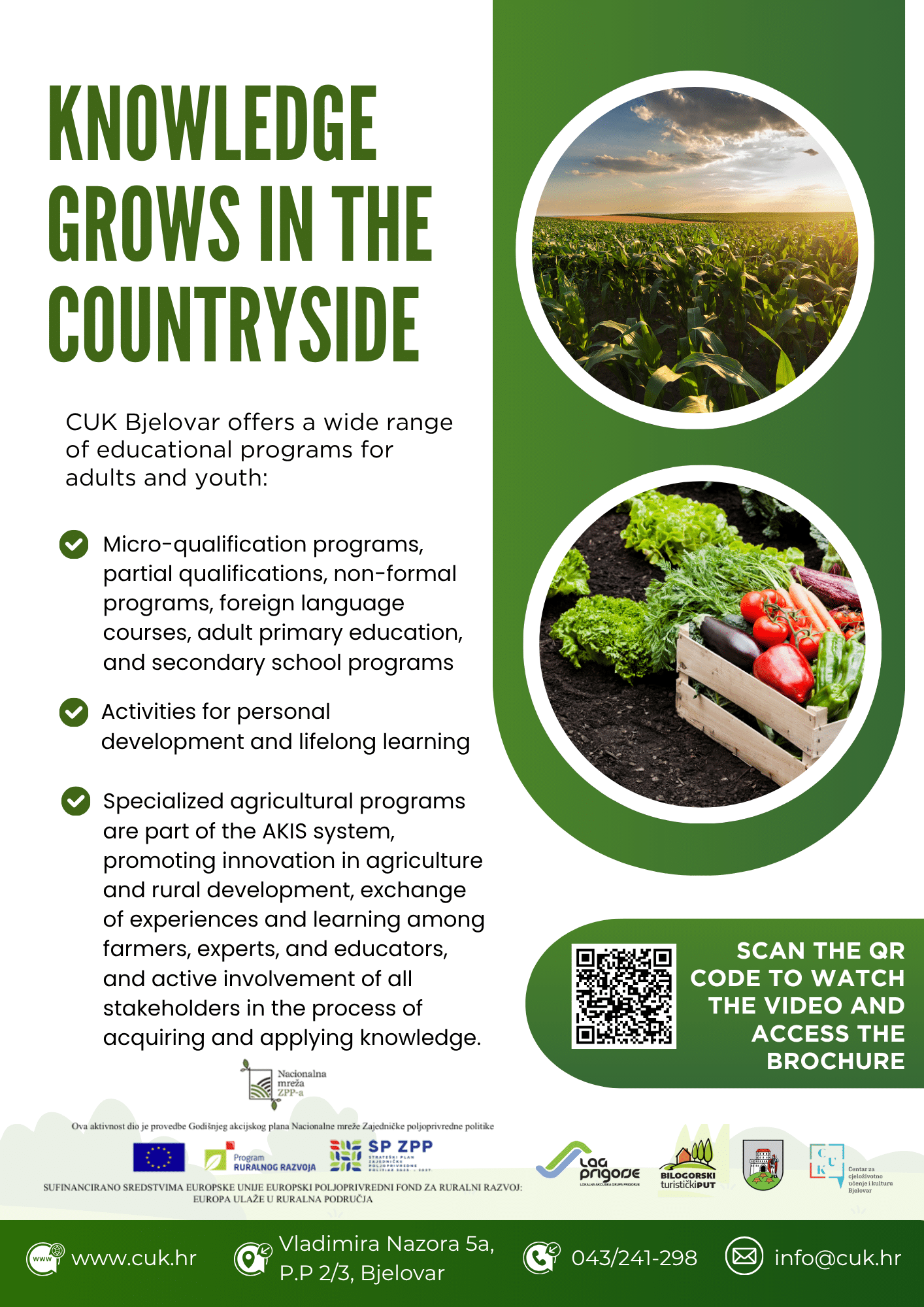 U sklopu projekta „Znanje raste na selu“, u suradnji s Centrom za cjeloživotno učenje i kulturu Bjelovar, LAG-om Prigorje i Udrugom Bilogorski turistički put, zajedno s poljoprivrednicima, polaznicima i edukatorima Centra za cjeloživotno učenje i kulturu Bjelovar, radili smo na promicanju prijenosa znanja iz obrazovnog sektora u praksu ruralnog razvoja.