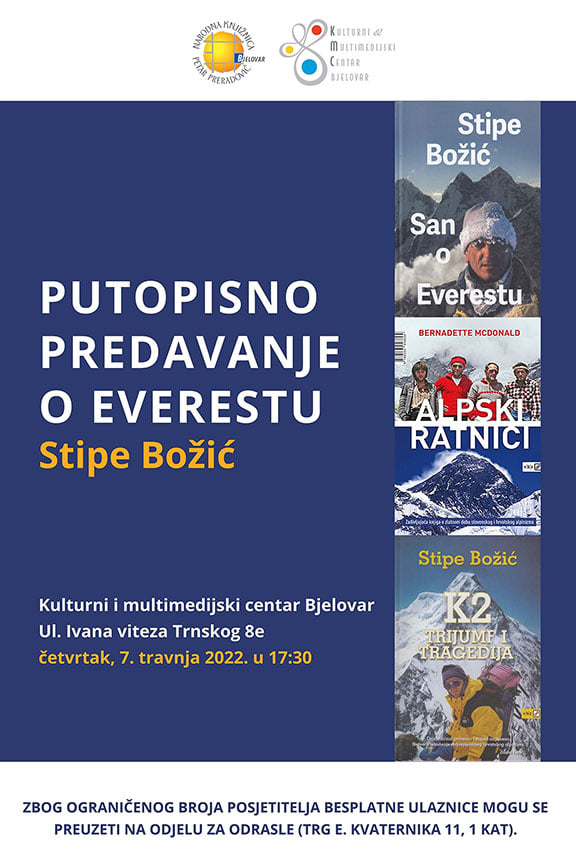 Poznati alpinist, pisac, fotograf, filmski snimatelj i redatelj Stipe Božić u četvrtak će, 7. travnja 2022., održati Putopisno predavanje o Everestu. Predavanje počinje u 17:30 sati u Kulturnom i multimedijskom centru u Bjelovaru, Ul. Ivana Viteza Trnskog 8e. Ulaz je besplatan, ali zbog ograničenog broja posjetitelja, ulaznice možete preuzeti na Odjelu za odrasle naše knjižnice (Trg E. Kvaternika 11, 1 kat).